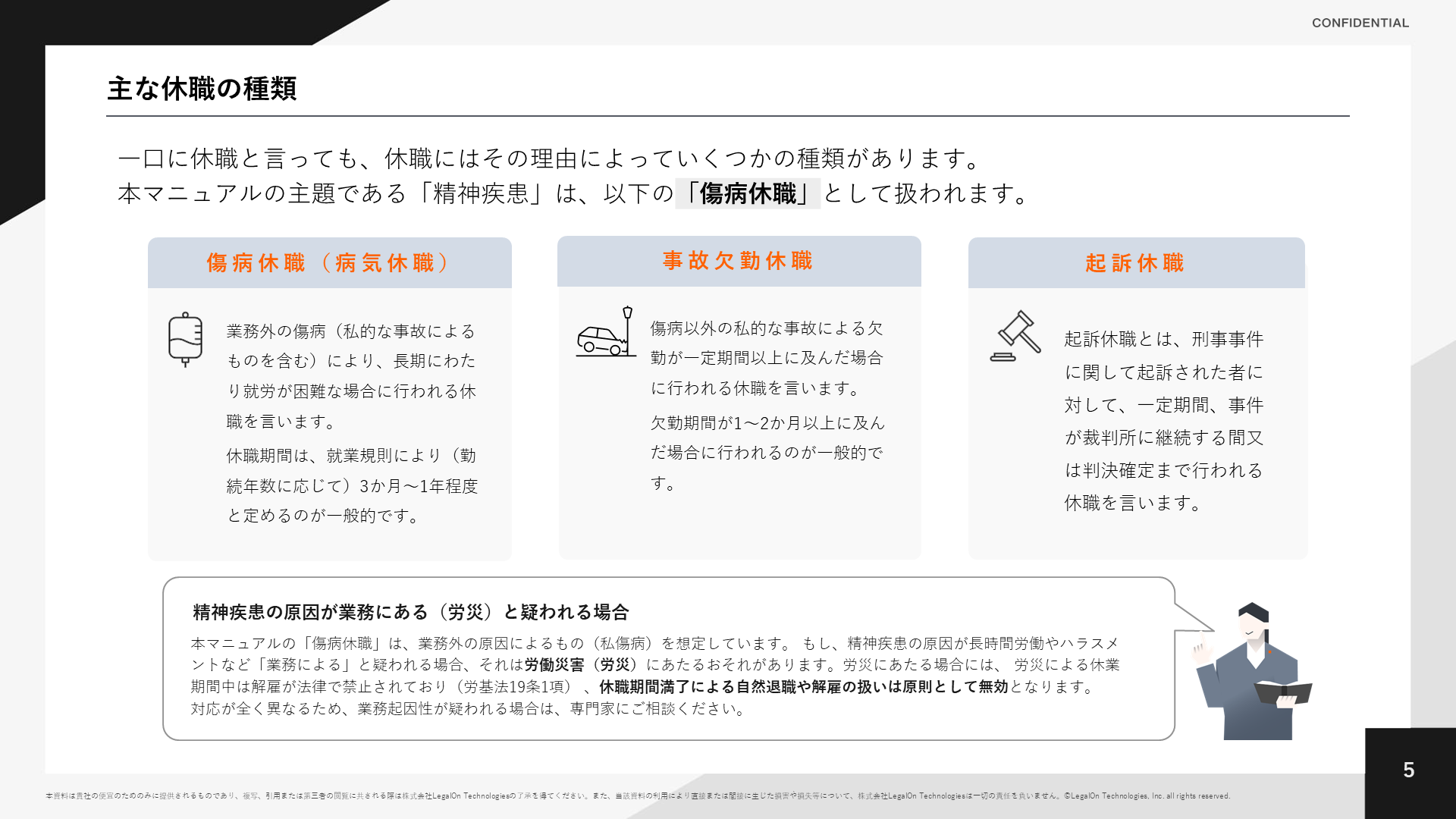本資料は、弁護士監修のもと、休職制度の設計から復職支援までの実務ポイントを体系的に整理しています。