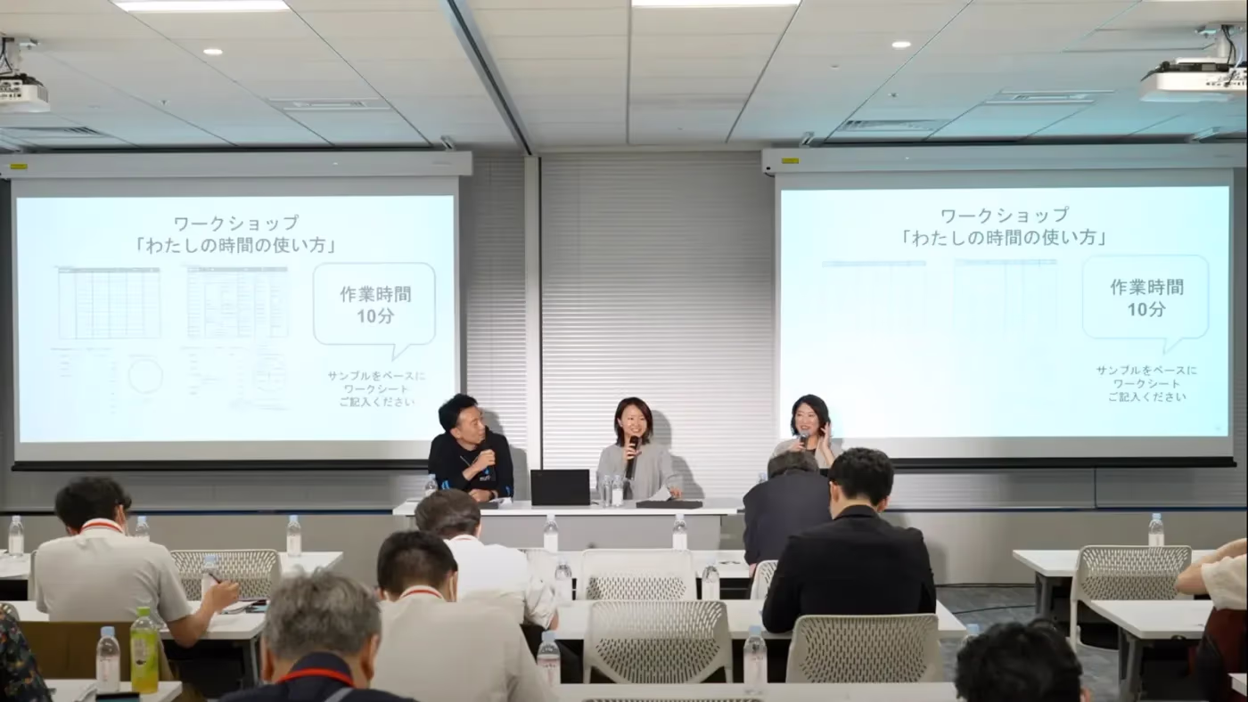 前半は参加者の方々が自身の1週間をワークシートに書き出す「わたしの時間の使い方」のワーク、後半は飯田様、仲條様が実際に書いたワークシートを紹介しながらのパネルディスカッションという二部構成です。