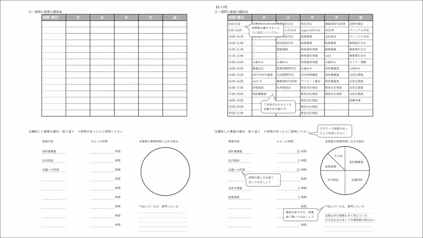 飯田様(以下、飯) そうです。普段はGoogleカレンダーの色分け機能で同じことをやっています。ひとり法務なので、上長が法務担当者ではないんですね。それで「普段、何をやっているの?」と聞かれたときに、ワークシートの下半分のような資料を提出できるようにしています。
