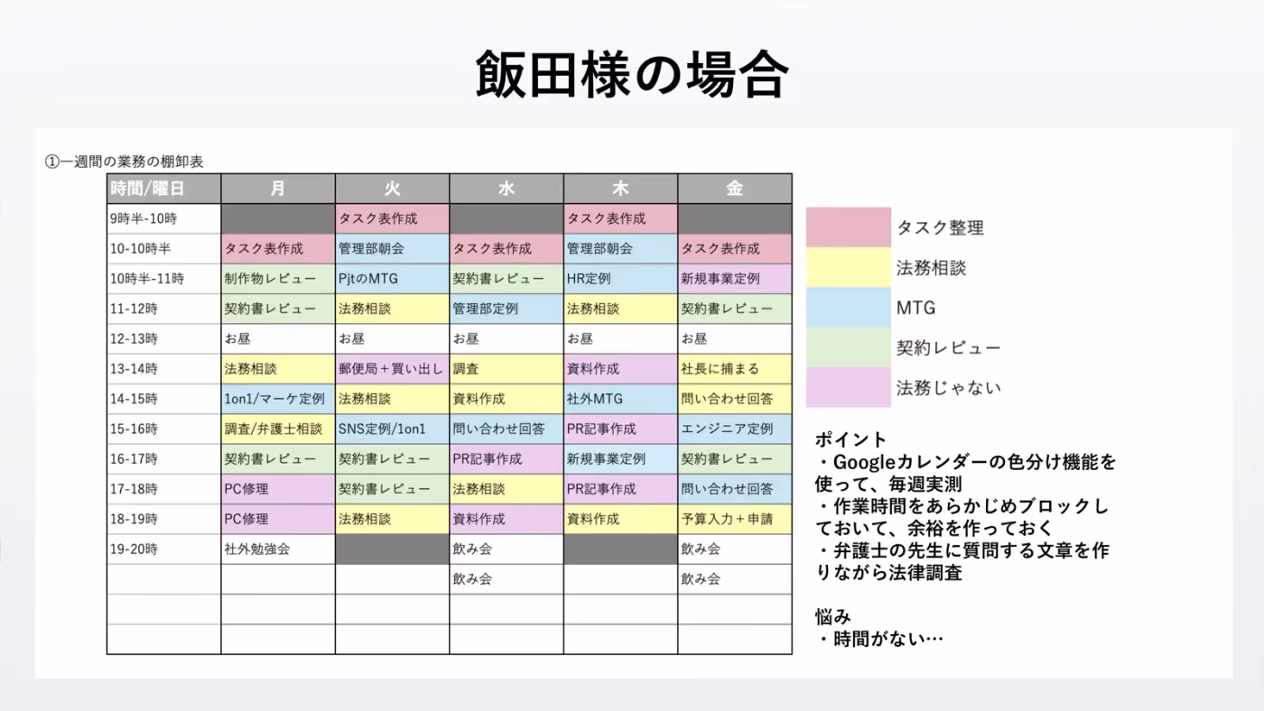 飯 兼務している法務以外の業務もあるので識別しやすいように。Googleカレンダーに色分け機能があって、色別に総時間を集計できるんですよ。業務量のコントロールや業務ごとの所要時間の把握のために、毎日色分けするようにしています。