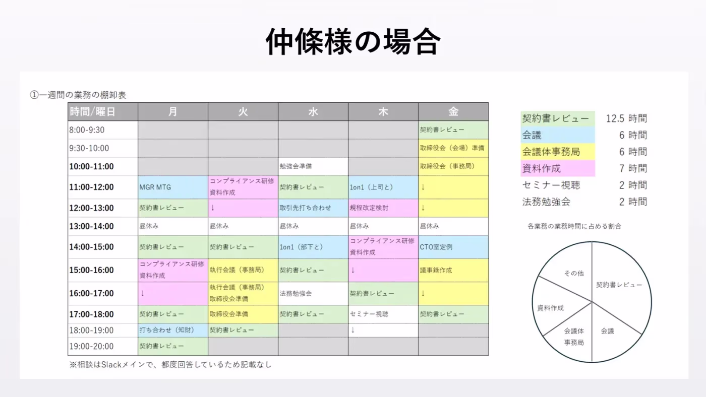 仲 ひとり法務4年目当時のスケジュールです。法務相談はSlackで来ることがほとんどで、都度即対応を心がけていたので表に入れていません。工夫した点でいえば、当時は子供の塾のお迎えがあって、その曜日は退社時間が決まっていたんですね。その直前にレビューの予定を入れていました。「絶対にこの時間に上がらなければいけない」というのが後ろにあると、すごい集中できるんです。