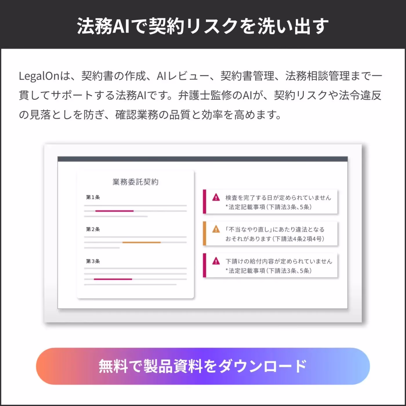 <関連記事>AI契約書チェックとは?仕組み・適法性・メリット・ツール選定方法を徹底解説