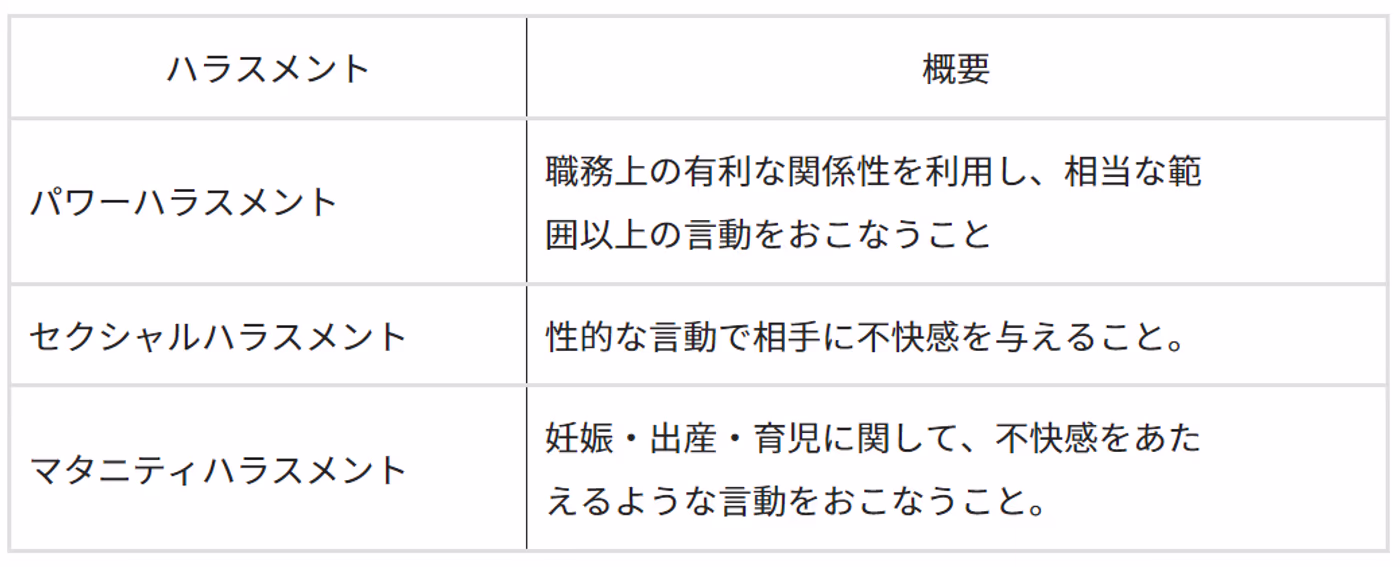 なお、ハラスメントにはさまざまな種類があることから、防止策や対処もさまざまです。主なハラスメントとしては、以下のようなものが挙げられます。