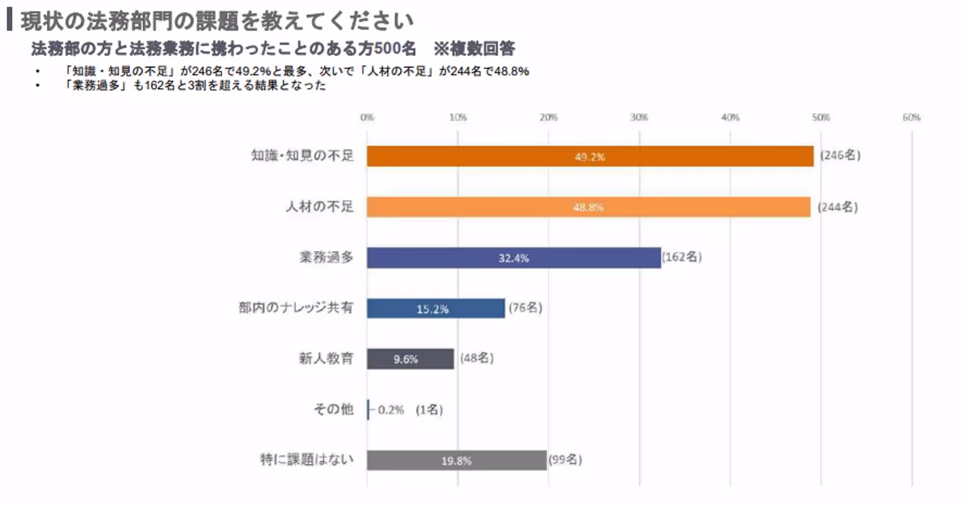 また、LegalOn Technologiesが法務担当者に調査したところ、約半数の担当者が「人材の不足」と答えました。