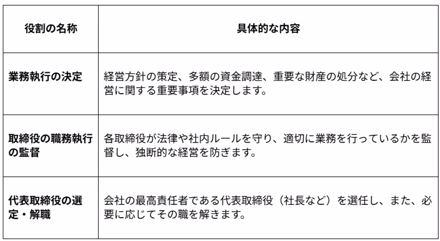 取締役会とは、株式会社の経営に関する重要な意思決定を行う、会社の健全な運営に欠かせない機関です。その主な役割は多岐にわたりますが、特に重要なものとして、以下の表に示す3つの役割が挙げられます。