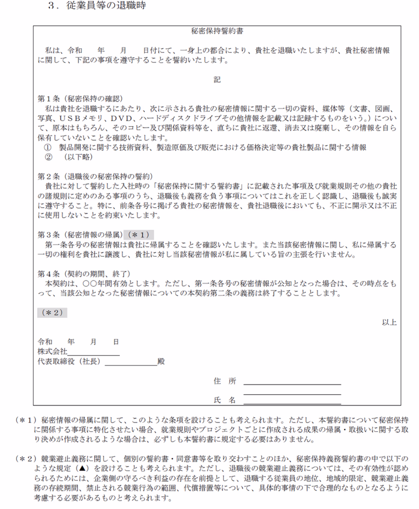 ① 貴社で従事した○○の開発に係る職務を通じて得た経験や知見が貴社にとって重要な企業秘密及びノウハウであることに鑑み、当該開発及びこれに類する開発に係る職務を、貴社の競合他社(競業する新会社を設立した場合にはこれを含む。以下同じ。)において行うこと