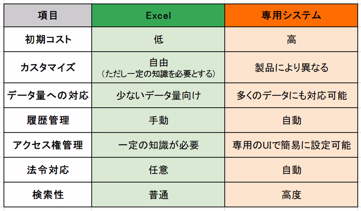 契約書の管理方法として、Excelと専用システムを比較すると以下のようになります。