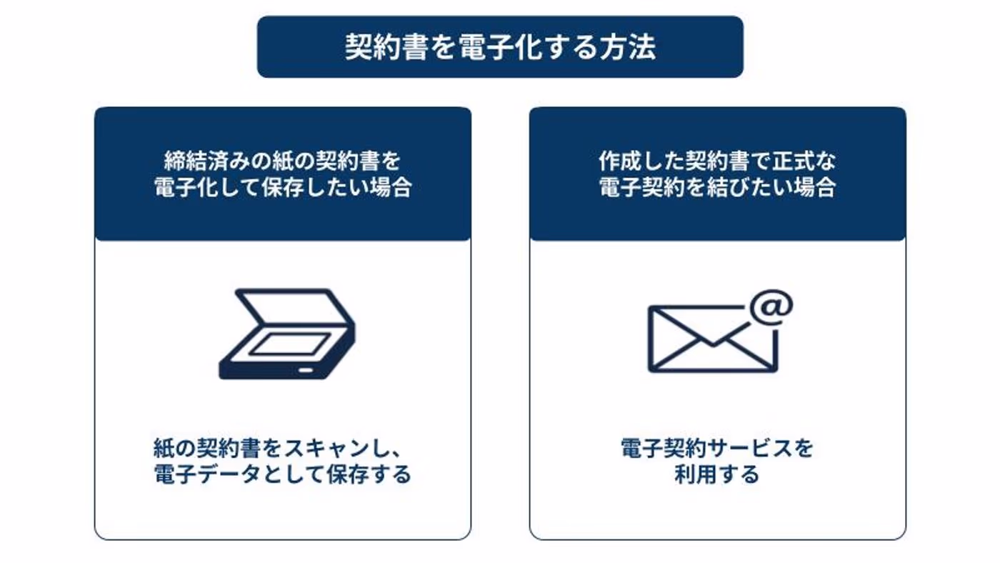 契約書の電子化には、利用目的に応じて大きく2つの方法があります。それぞれの特徴や注意点を理解したうえで、自社に最適な方法を選びましょう。