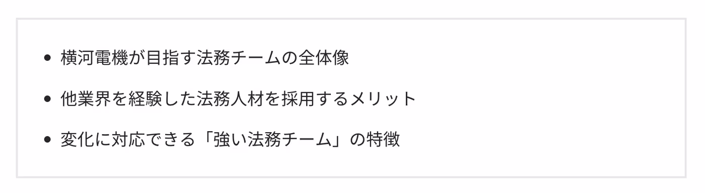 自社ビジネスを支援していく立場にある法務部としては、そのときどきの事業変革に合わせて・あるいは変化に先んじて、人材をそろえていく必要があります。こうした視点で中途採用を行った結果、当社法務部には同業の電気機器業種から転職してきた人はこれまでおらず、多様な人材がそろっています。他業界の法務経験者を積極的に採用することのメリットは3つあります。