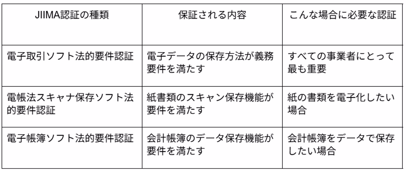 これは、国税庁が認める機関が「このソフトウェアは電子帳簿保存法の要件を満たしています」とお墨付きを与えた証です。ただし、JIIMA認証には下の表のように複数の種類があるため注意が必要です。