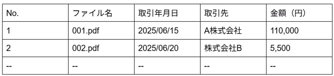 例えば、「20250623_株式会社サンプル_11000」のように、「取引年月日_取引先名_金額」といったルールで統一すると、検索しやすくなります。