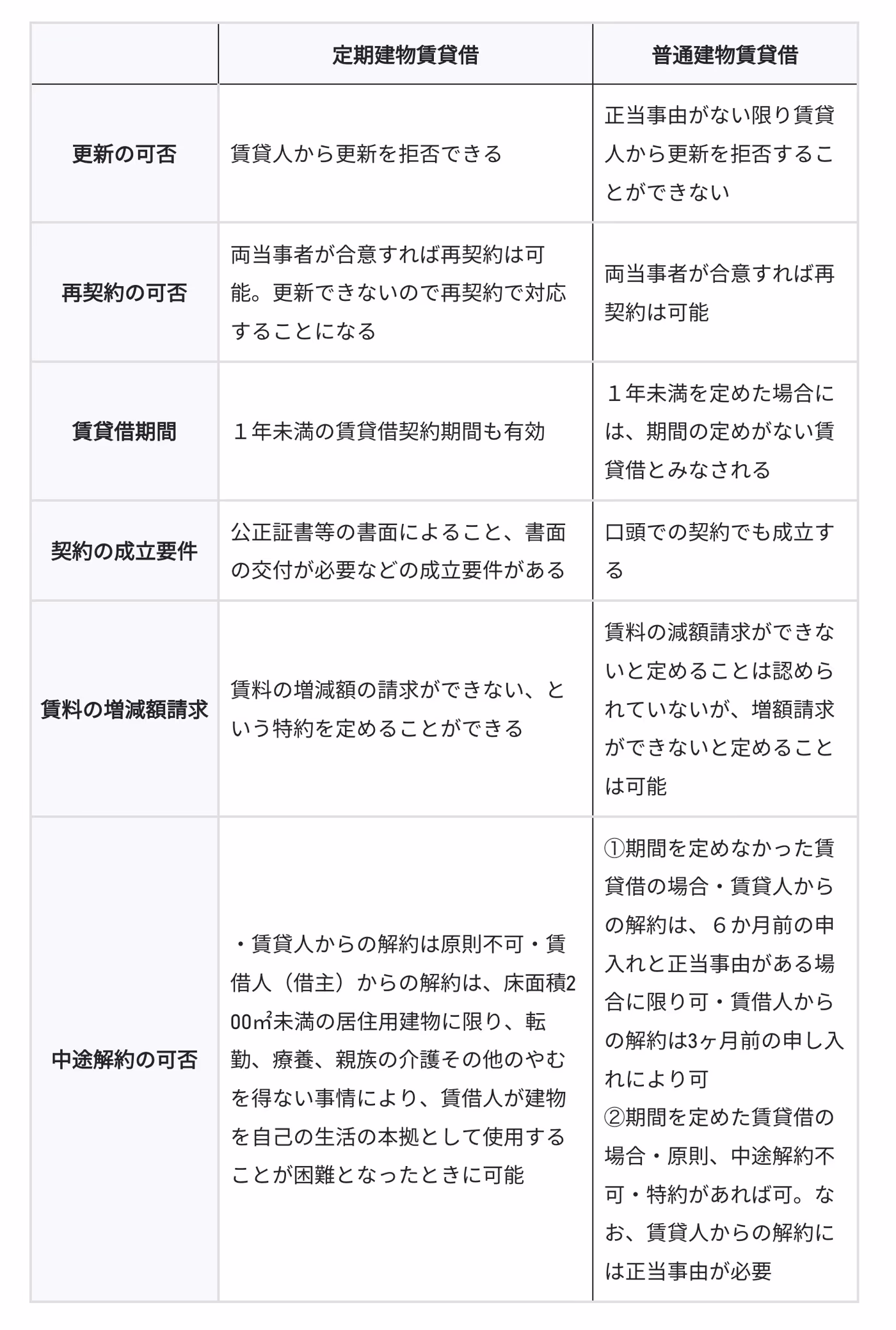 普通賃貸借契約では、正当事由がない限り賃貸人は更新を拒絶できませんが(同法28条)、定期建物賃貸借は更新を拒絶できます。