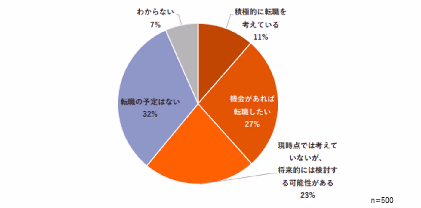 「転職の予定はない」がもっとも多かった一方、「積極的に転職を考えている」「機会があれば転職したい」も合わせて38%に上りました。