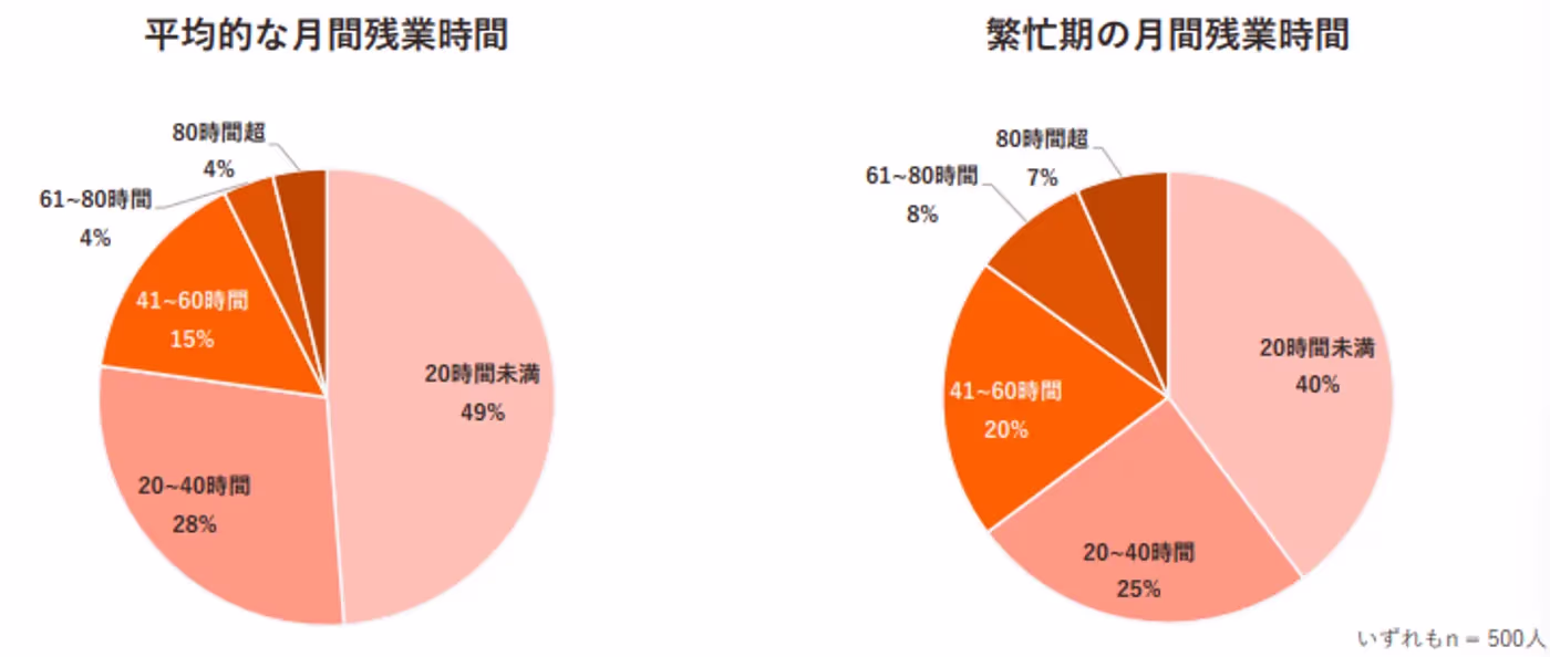 月間の平均・繁忙期の残業時間について聞きました。平均残業時間・繁忙期ともに「20時間未満」が最も多いという結果でした。一方、平均と繁忙期の残業時間を比較すると「41時間以上」と答えた人が15%増えました。