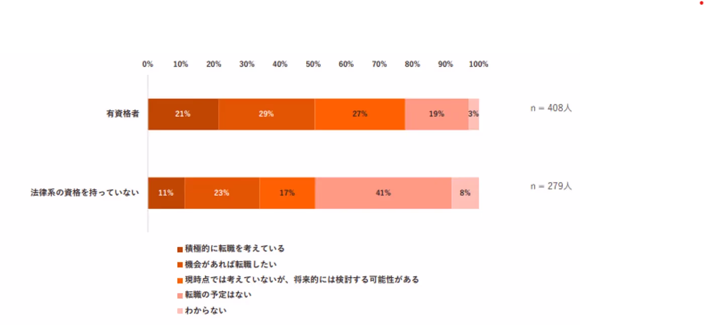 調査対象者のうち、法律系の資格を持っている人と持っていない人とで転職意向を比較すると、法律系の有資格者の方が転職意向が高い傾向でした。