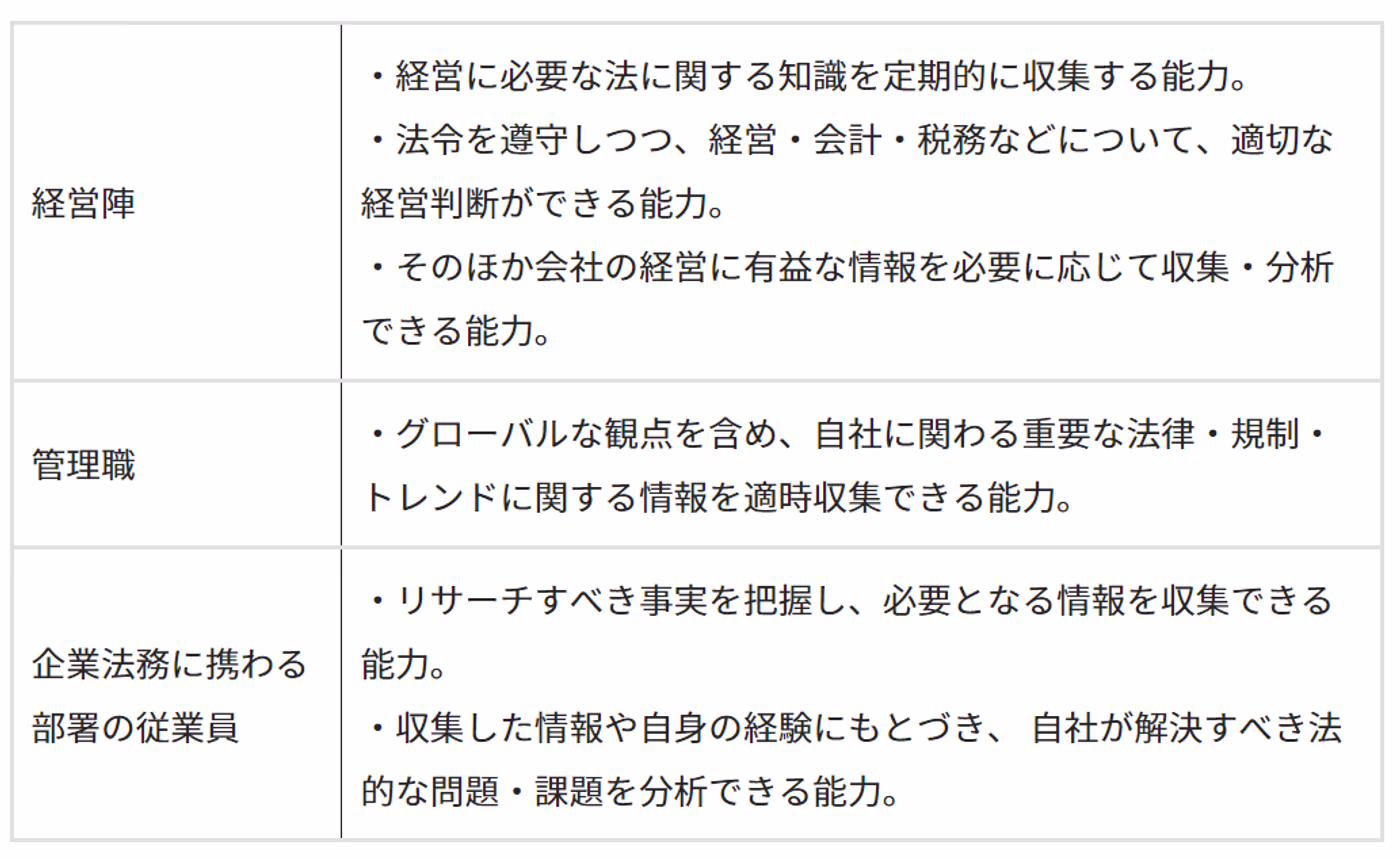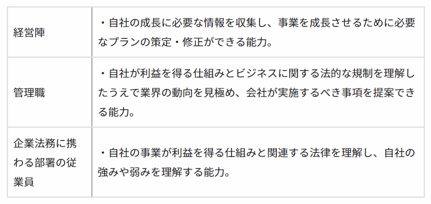 法務に携わるうえでは、以下のような知識・スキルを備えておくことが必要です。