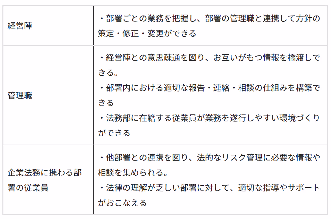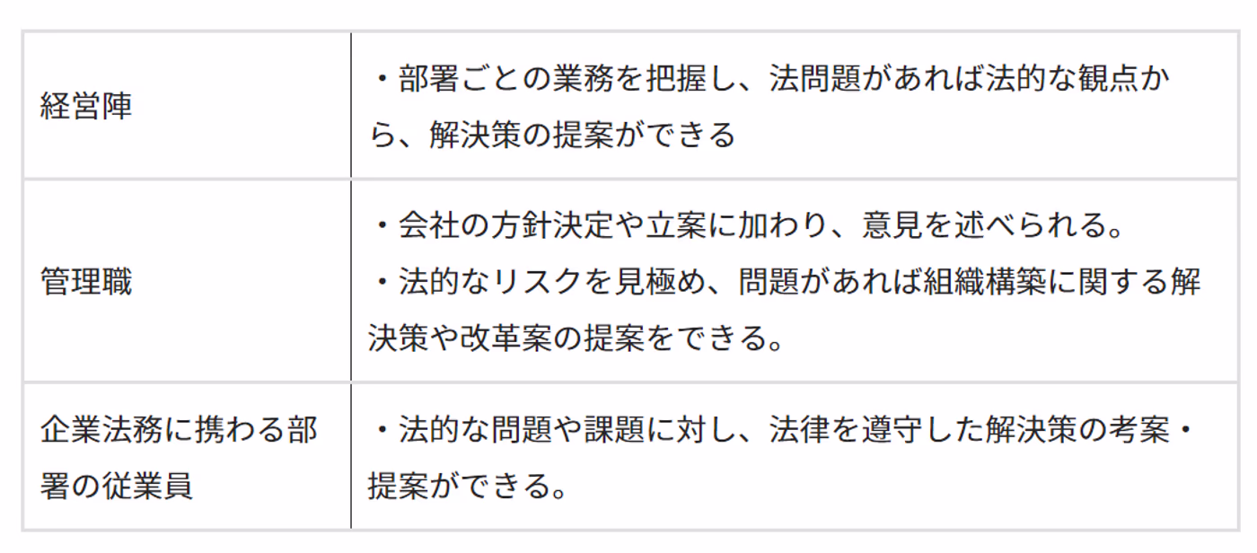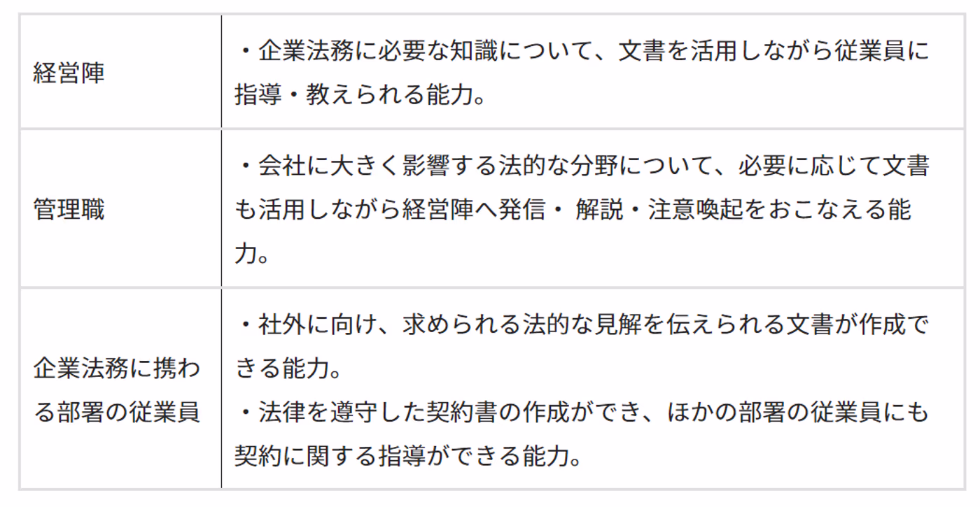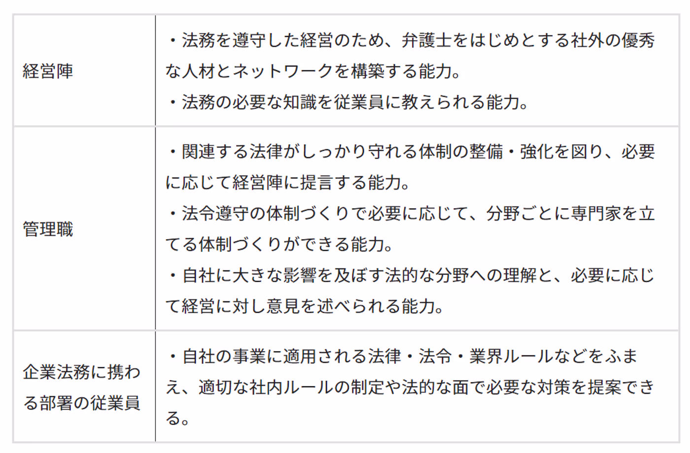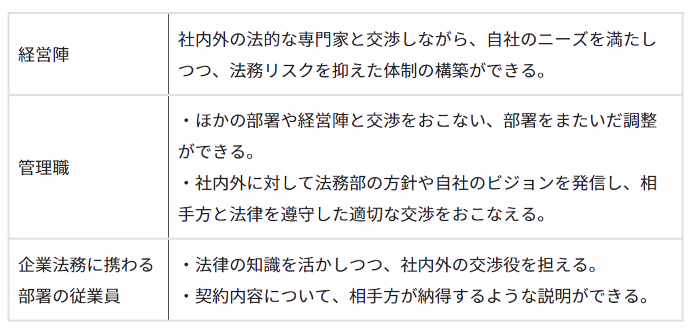 スキルマップは、従業員の業務におけるスキルレベルを表したものです。業務に関する能力やスキルを測ることにより、不足している能力の把握・改善、および教育計画の策定をおこないます。求められるスキルは携わる業務によって異なり、評価の対象が変わります。企業法務の場合には、以下の人物が対象です。