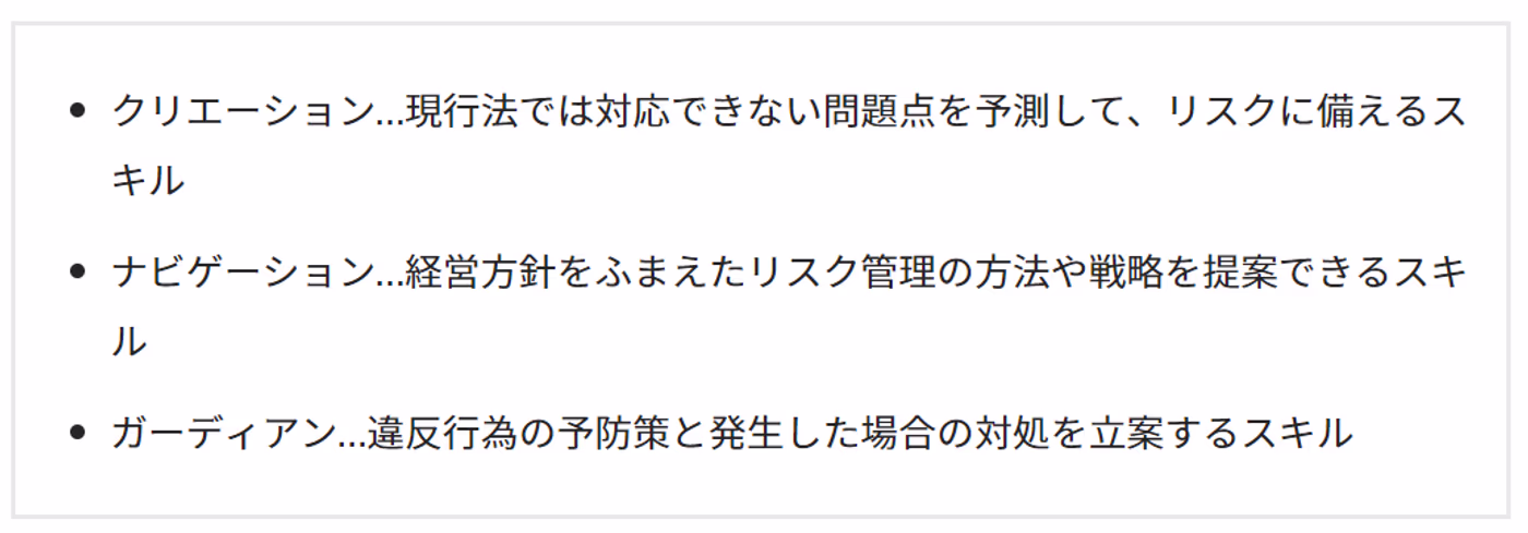 上記のほか、企業法務では以下のようなスキルも求められます。