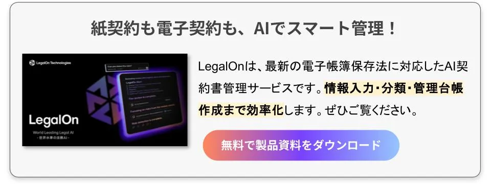 LegalOnの契約書管理機能では、書類をアップロードするだけで、自動で分類・項目抽出を行い、管理台帳を自動作成します。また、電帳法対応に必要な保存要件をAIが自動でチェックでき、不足している要件がある場合はアラートを出し、確実な法令対応をサポートします。契約書や電子帳簿など、面倒な書類管理が手間をかけることなく、適切に管理することができます。