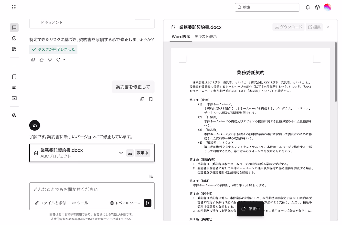 契約書レビューを例にすると、従来のLegalOnアシスタントでは「契約書をレビューしてください」というプロンプトを入れると、その契約書の内容を読んで、「こんなリスクがある」と列挙してくれます。