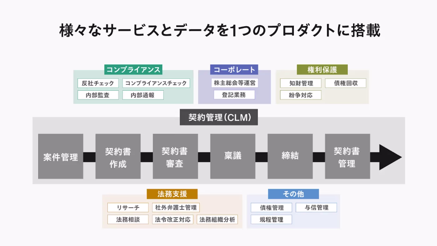 対応する領域は、契約のマネジメント(CLM)にとどまらず、法務業務領域全体に拡大する予定です。これにより、法務担当者は一つのプロダクトで業務をすべて完了できるようになります。