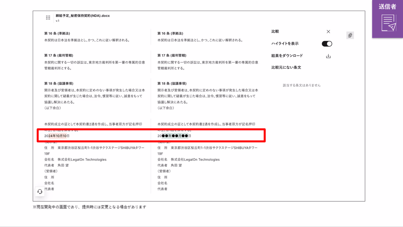 LegalOn Cloudであれば、二つの書面をアップロードすると差分がハイライトで表示され、変更された内容に問題がないかを簡単にチェックすることができます。その後、シームレスに電子締結の手続きを行うことができます。