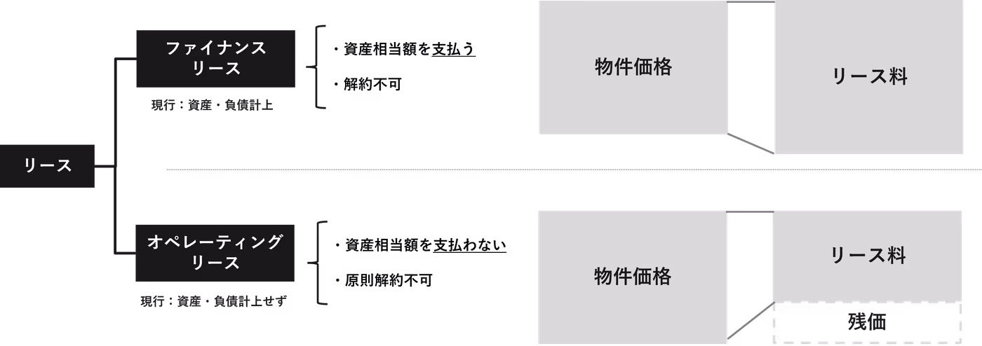 - オペレーティングリース:ファイナンスリース以外のリース。OA機器など、使用期間や機器の更新などに関して柔軟に判断したい場合に適用される。新リース会計基準適用前はリース料として資産相当額を支払わない。