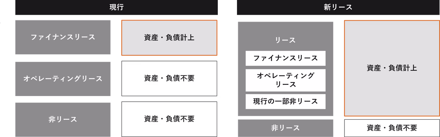 これまでは、リース取引を「ファイナンスリース」と「オペレーティングリース」に区分し、会計上、資産・負債に計上されるのはファイナンスリースのみでした。新リース会計基準ではリース取引の区分が廃止され、原則全てのリース物件が貸借対照表において資産・負債に計上されるようになります(下図)。