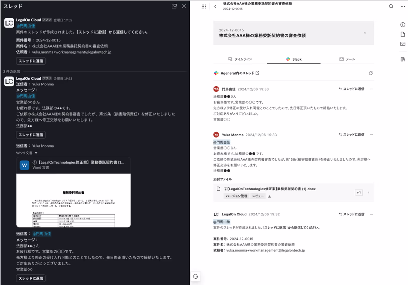 LegalOn Cloud上でSlack上の任意のチャンネルにスレッドを作成すると、それ以降、法務メンバーはLegalOn CloudからSlackにメッセージを送信することができます。