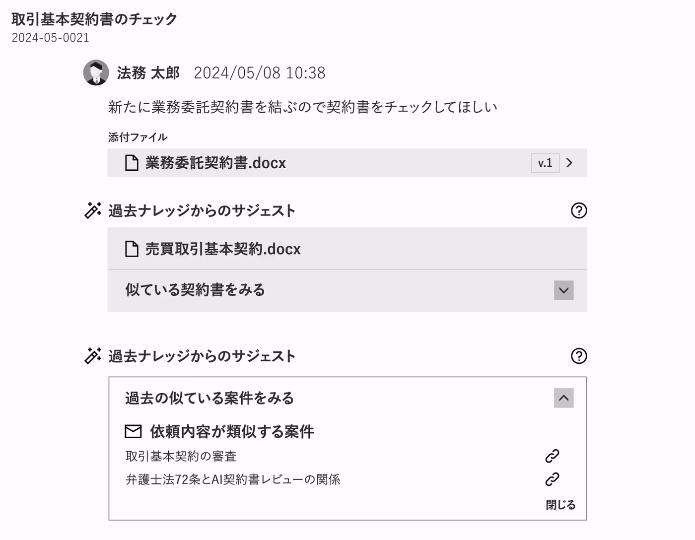 マターマネジメントモジュールの画面イメージ。たとえば契約書チェックの際、AIが似た案件や関連する契約・情報をサジェストしてくれる