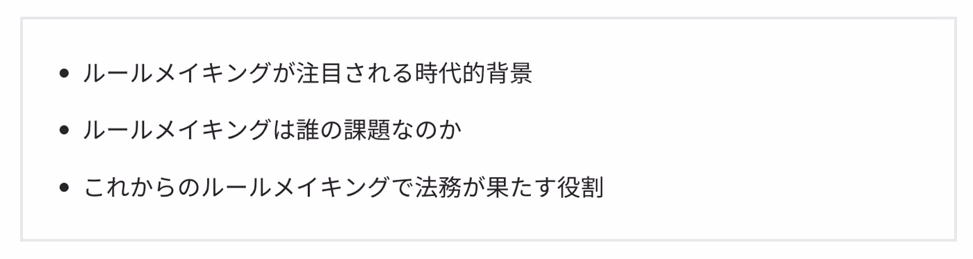 ルールメイキングにはロビイングのイメージが強いかもしれませんが、普段の法務と地続きであり、オプションでしかないという感覚を私はもっています。