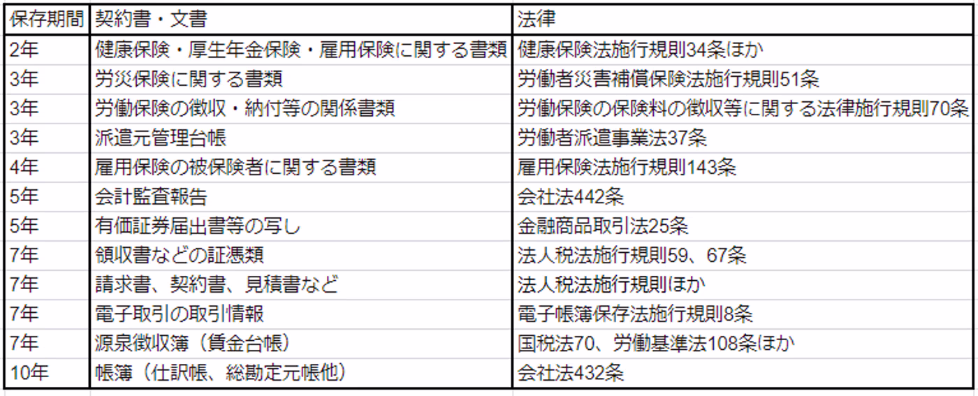 その他の契約書・各種書類にも、法律で保管期間が定められています。代表的な契約書・書類の保管期間と、それぞれの根拠となる法律は以下の通りです。
