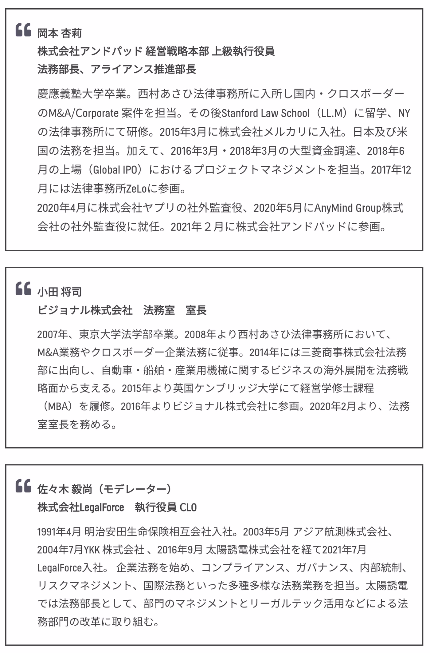 佐々木氏 お二方が、海外留学を経験した後に、あえてベンチャー企業の法務にチャレンジした理由を教えてください。