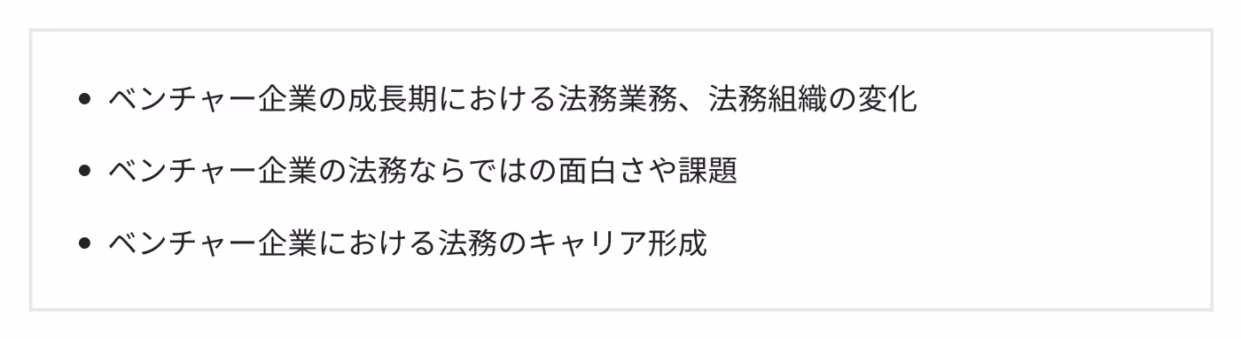 佐々木氏 まずはお二方のご経験から、ベンチャー企業の法務の特徴をお聞かせください。
