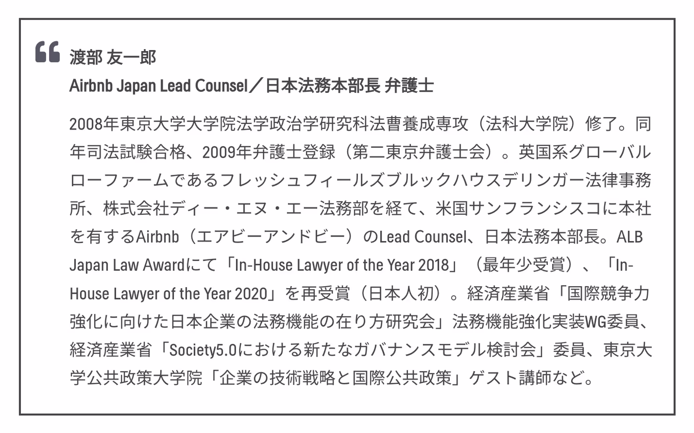 法務は万能ではありません。必要なプロフェッショナルの力を借りて、法律論・公共政策に役立つ議論を提供することで、みなさんのビジネスゴールの実現に寄与する法務を確立していってほしいと強く願っています。