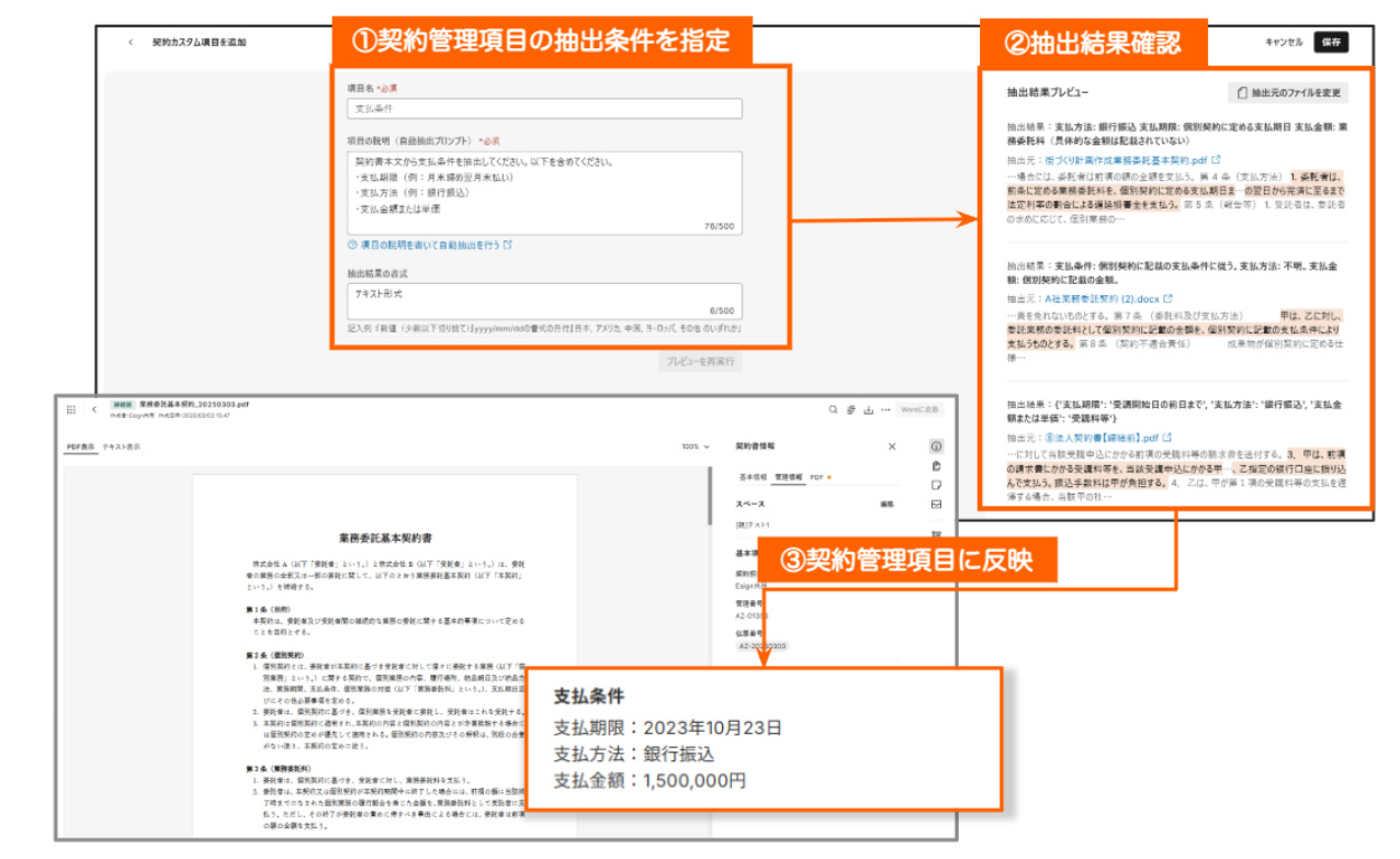 ※本機能はサービス管理者が契約カスタム項目の作成・抽出ルールの設定を行う必要があります。AIの自動認識によるため精度は100%ではありません。