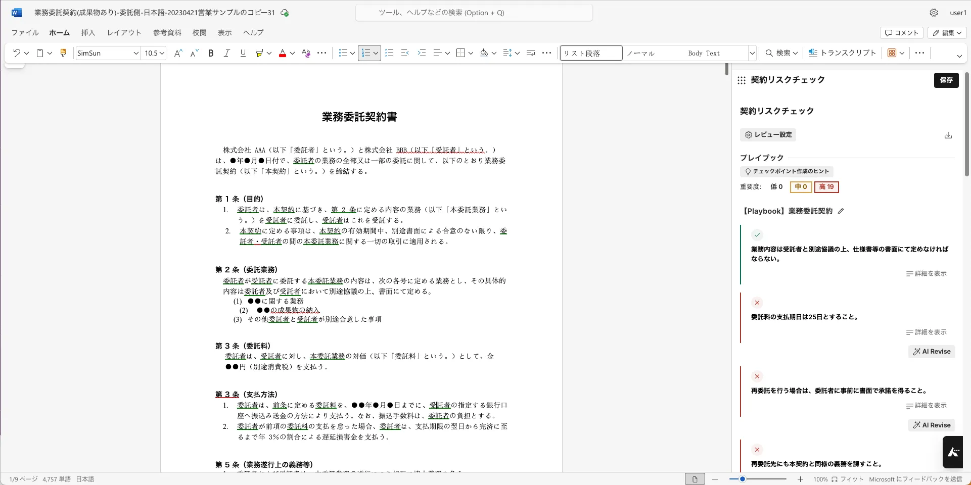 Word の操作性を維持しながら、「LegalOn」の契約リスクチェック機能を同じ画面上で併用できるため、契約書の編集とレビューをシームレスに完結できます。