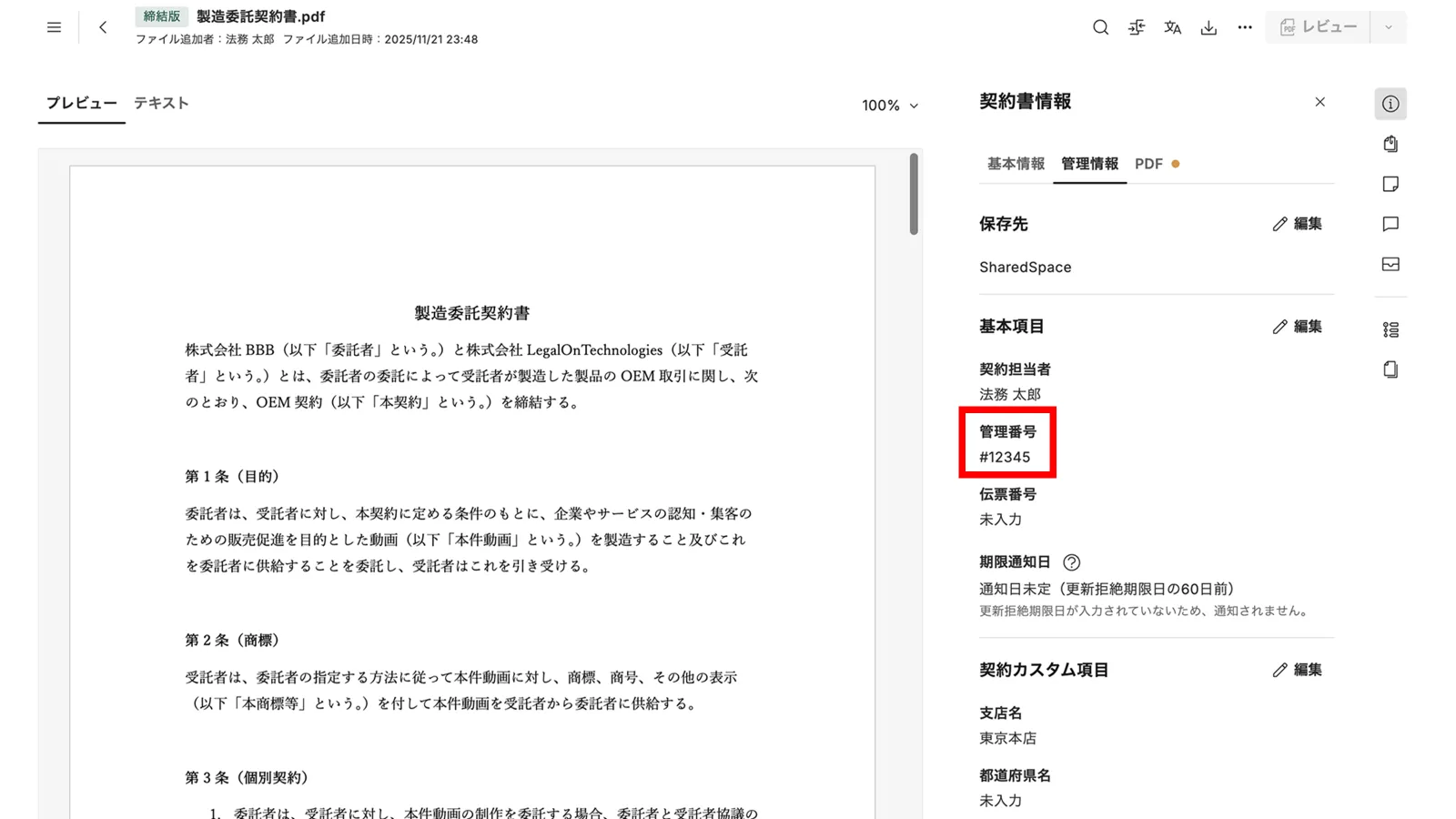 ▽契約書アップロード後に、自動採番された際の画面イメージ