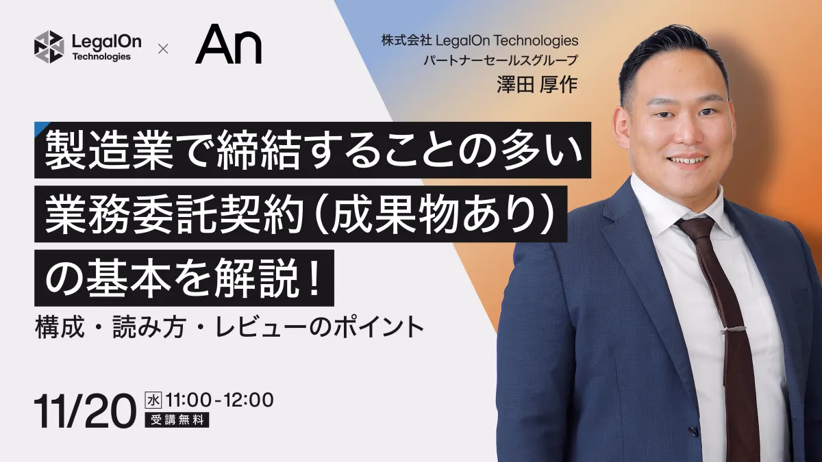 今回は、製造業で締結することの多い、業務委託契約(成果物あり)の審査・確認に必要な基本的な内容を丁寧に解説していきます。その類型は何のために締結する契約か、要注意ポイント・どういう意識で審査すればよいか、重要条文の解説と修正文例、成果物の権利や検査の条文、その他印紙などを解説します。