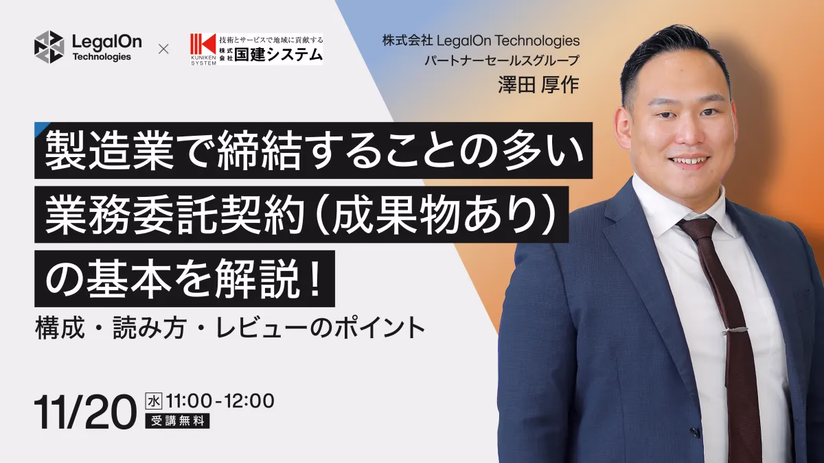 今回は、製造業で締結することの多い、業務委託契約(成果物あり)の審査・確認に必要な基本的な内容を丁寧に解説していきます。その類型は何のために締結する契約か、要注意ポイント・どういう意識で審査すればよいか、重要条文の解説と修正文例、成果物の権利や検査の条文、その他印紙などを解説します。