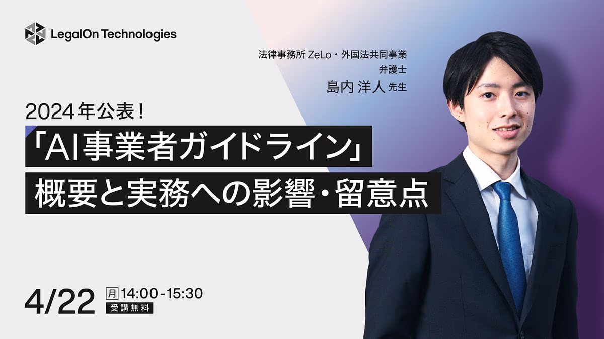 本セミナーでは、最新のAI事業者ガイドラインについて、その概要や実務への影響・留意点を解説します。講師は、AI分野の法規制に関する実務対応を行い、法律事務所ZeLo・外国法共同事業の「AI Practice Group」で統括を務める、弁護士 島内洋人 先生です。