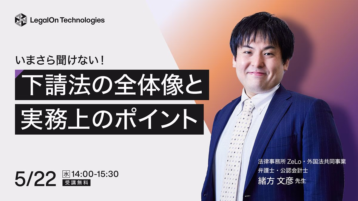 講師は、弁護士と公認会計士のダブルライセンスを持ち、下請法対応を含むコーポレート業務全般の実務に幅広く携わる、法律事務所ZeLo・外国法共同事業 弁護士・公認会計士の緒方文彦先生です。