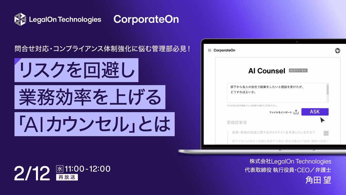 - 株式会社LegalOn Technologies(以下「当社」という)と同業他社に所属される方のご参加はご遠慮いただいております。
