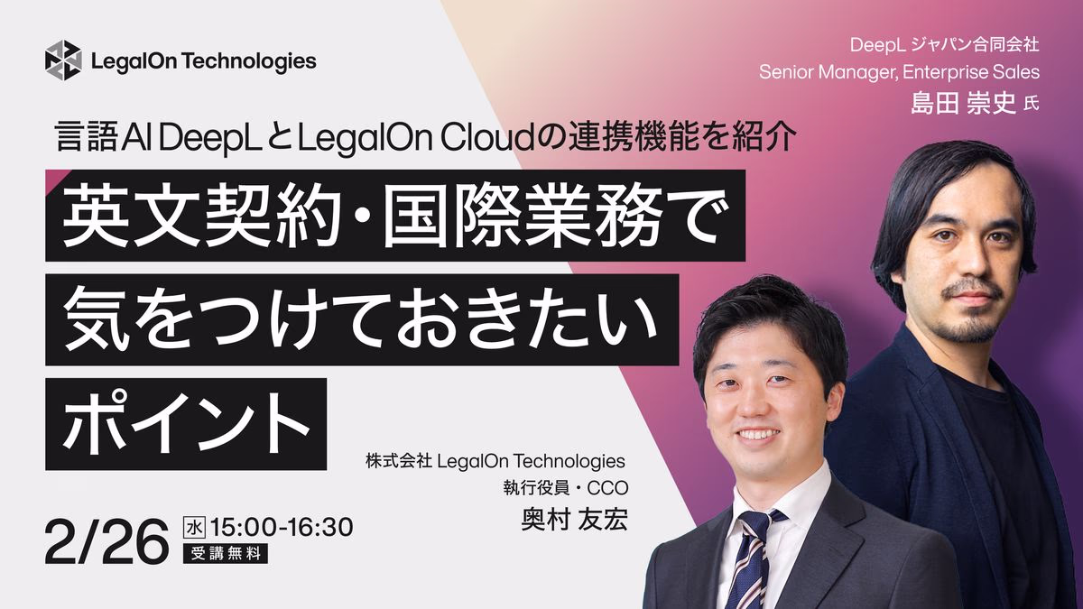 今回のセミナーでは、英文契約や国際業務で注意すべきポイントを解説するとともに、最新のAI技術を活用した効率化ツール「DeepL」と「LegalOn Cloud」の連携機能をご紹介します。