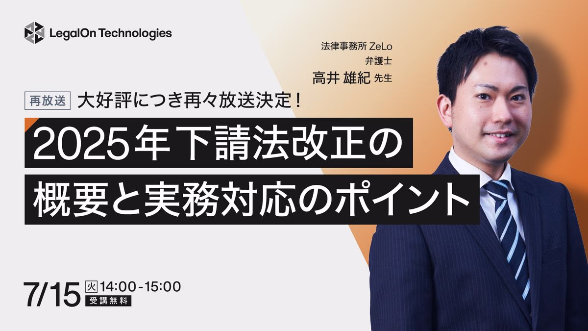 ※本セミナーは、2025年5月21日に放送した「実務担当者必見!2025年下請法改正の概要と実務対応のポイント」、2025年6月11日に放映した「好評につき、再放送決定!2025年下請法改正の概要と実務対応のポイント」の再放送です。