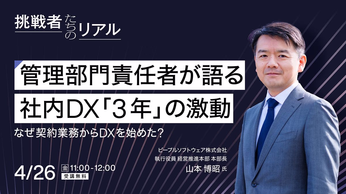 今回は、ピープルソフトウェア株式会社 執行役員の山本様をお呼びして「社内DX」を推進する上で実際に取り組まれた事例をお話いただきます。 山本様は「AI契約管理システム」LegalForceキャビネの導入を皮切りに、法務・総務・財務経理・人事労務まで、管理部門全体のDXを実現するため日々挑戦し続けられています。