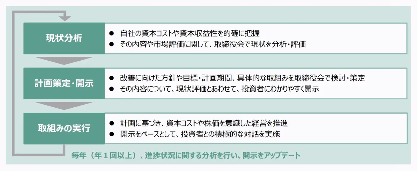 さらに2023年3月には東京証券取引所から「資本コストや株価を意識した経営の実現に向けた対応について」が発表され、上場企業に対する要請がより具体化されています。同資料では、プライム市場・スタンダード市場の全上場会社対象に、以下の一連の対応を要請しています。