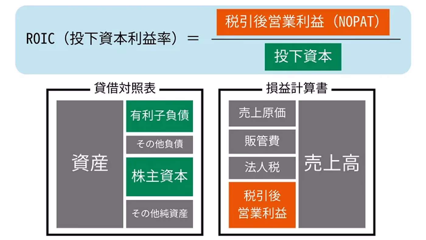- ROIC(投下資本利益率)= 税引後営業利益(NOPAT)÷ 投下資本