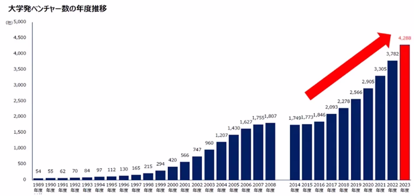 2023年10月、大学発ベンチャー数は4,288社となりました。前年度と比較して、506社の増加です。2023年10月の結果は企業数および増加数ともに、過去最高記録となりました。