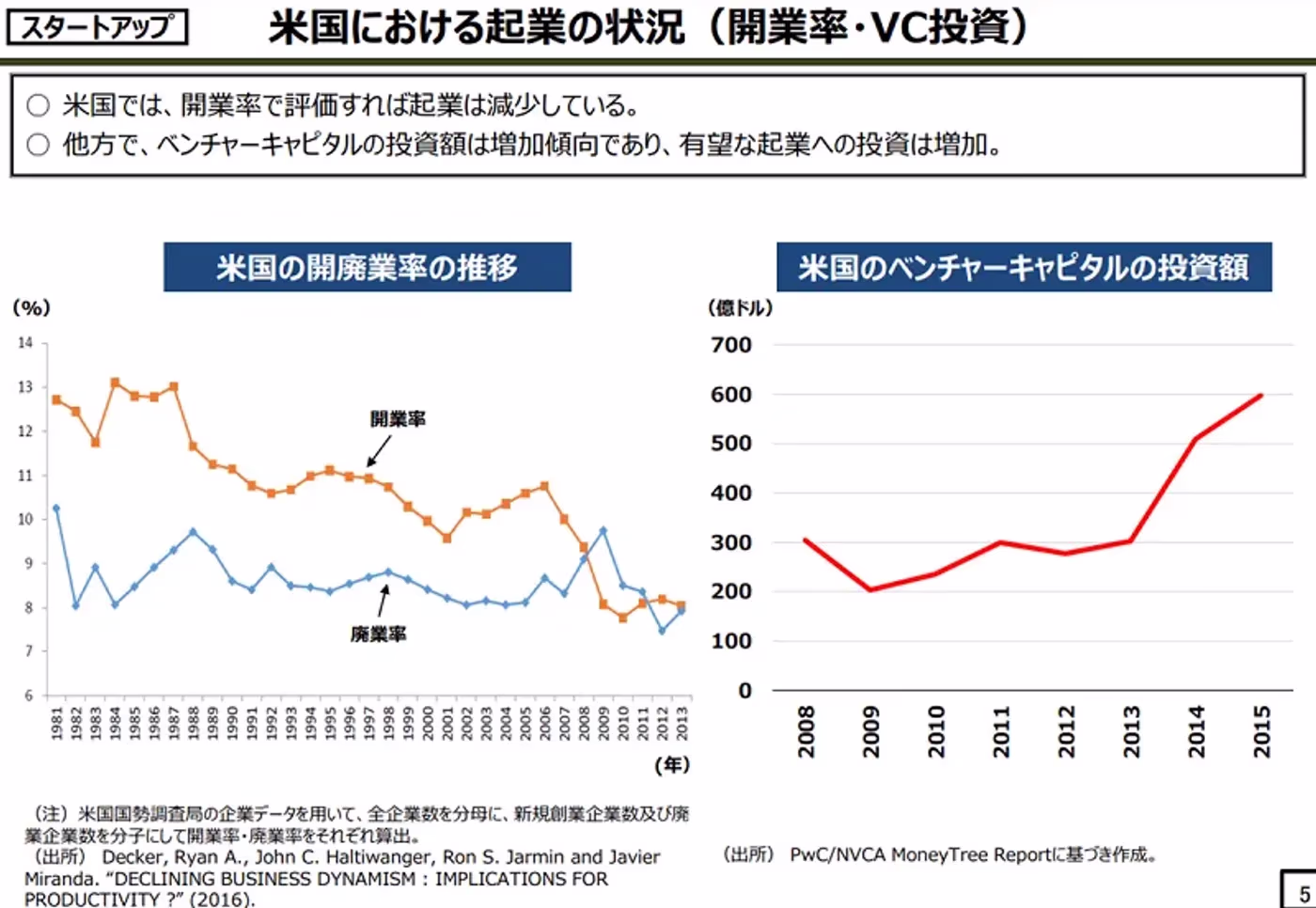 また令和4年に発表された内閣官房の資料では、米国での起業は減少傾向にある反面、ベンチャーキャピタルの投資額は増加傾向であることが示されました。